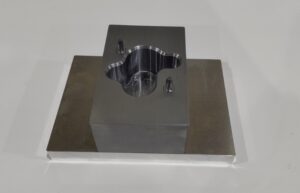 ワークの形状にぴったり合わせた溝を掘り、2つのピンで向きや位置を決定しています。